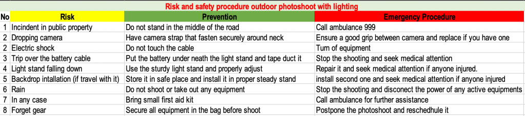 I would like to address all the risk and safety procedures when shooting outdoor in a table as follows: