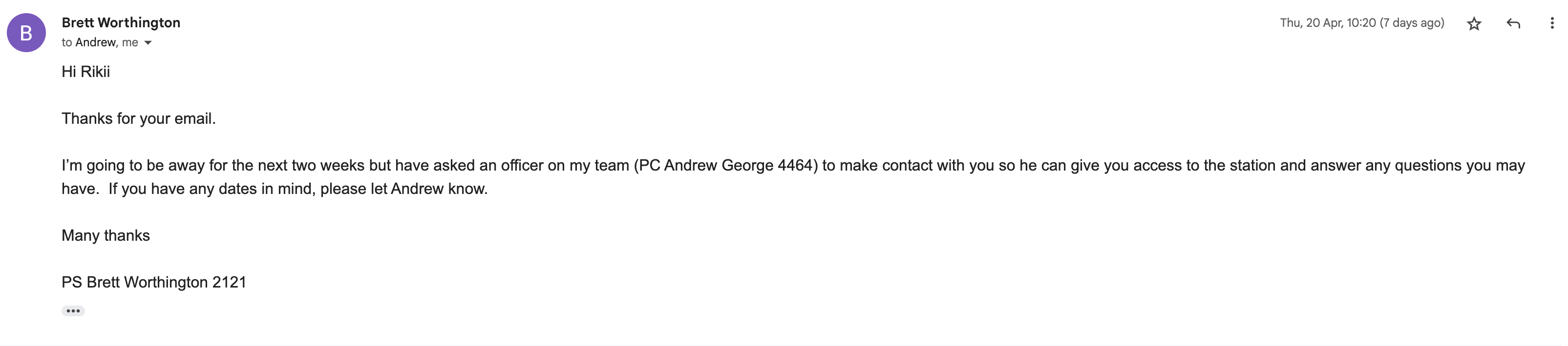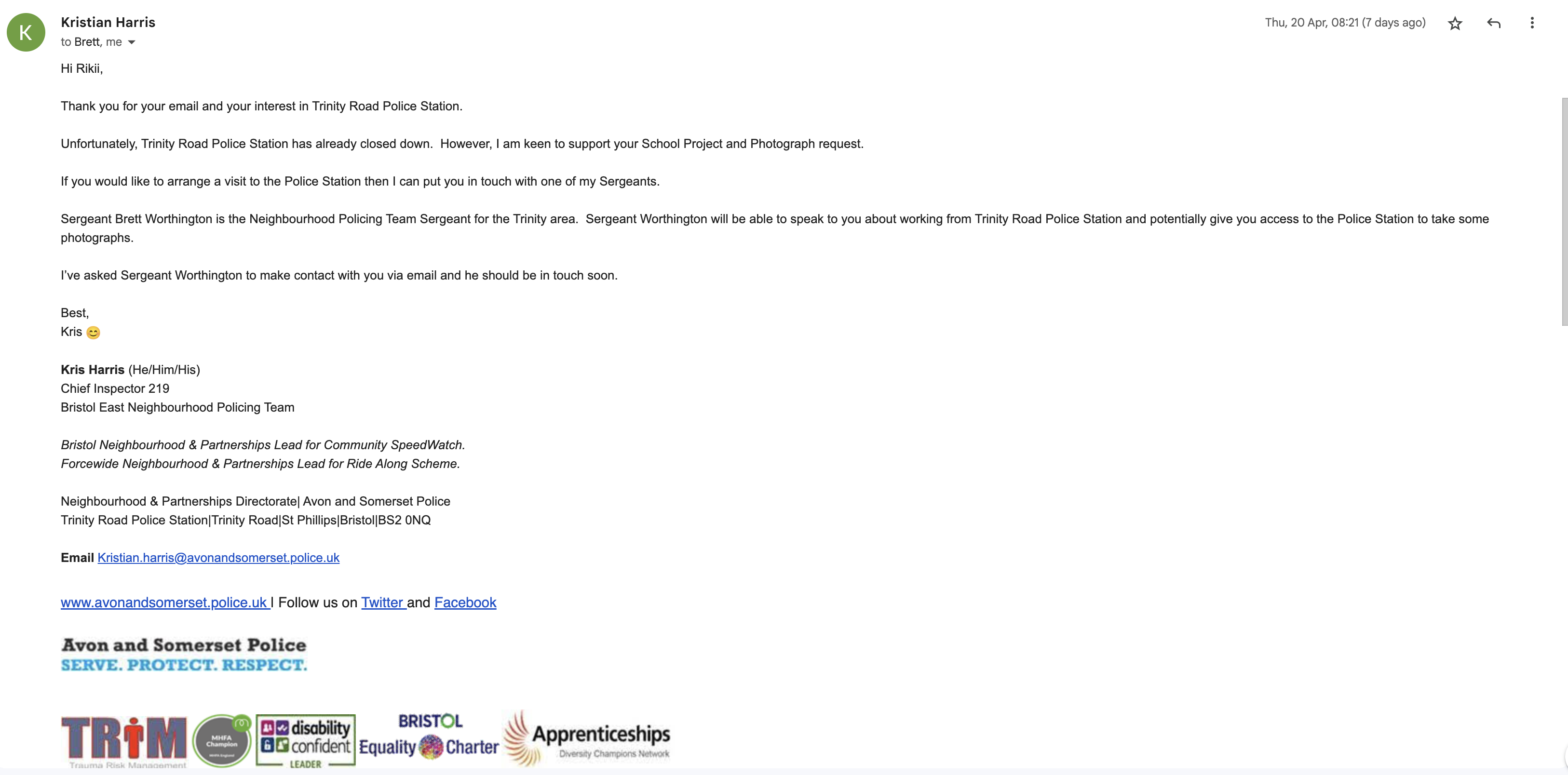 After receiving the information, I drove to Trinity Road. However, I cannot access it because I did not encounter any officers inside, but a staff member advised me to contact 101 for more information on how to gain access. As a result, I dialled 101 and explained my purpose as a student in relation to the task.