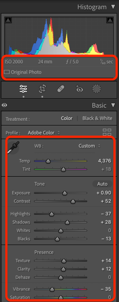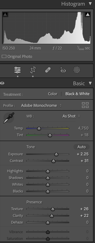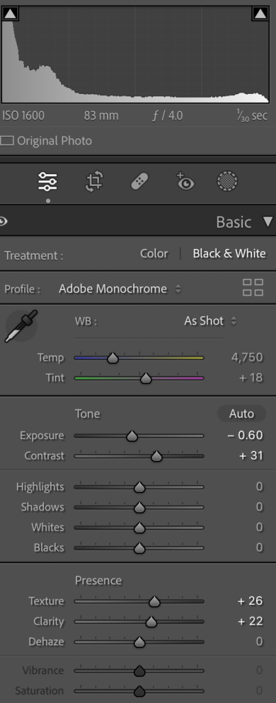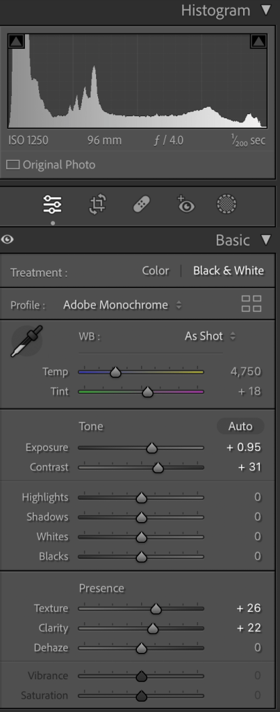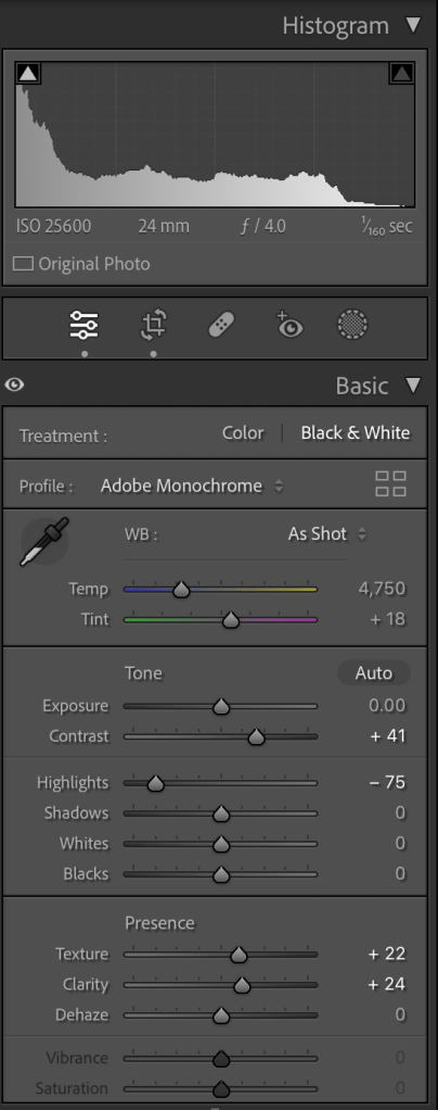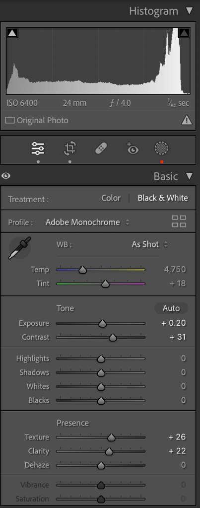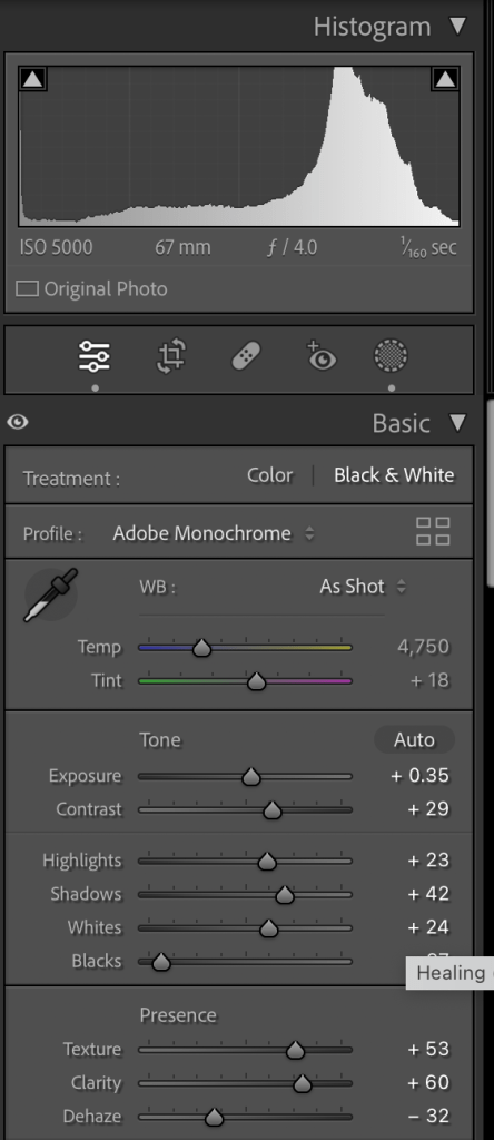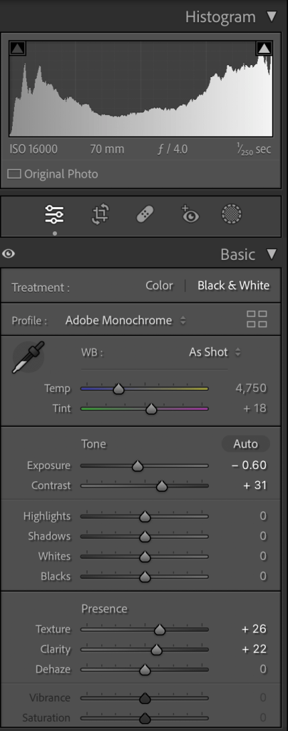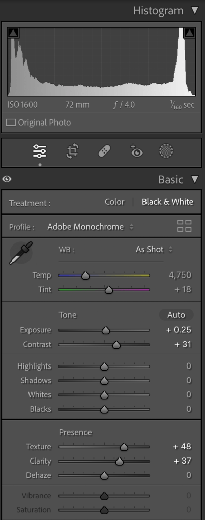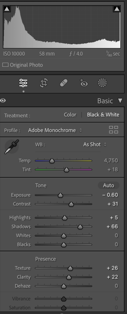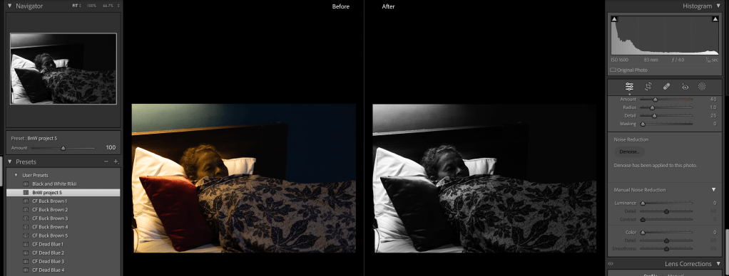 I adjust the light a little bit, added little contrast, reduced the noise and created the preset to apply for all my images that I can say more or less 600+.