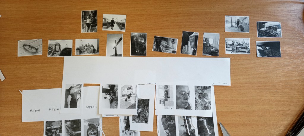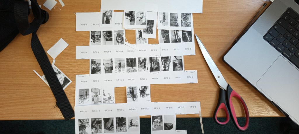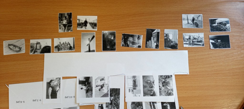In this section, I am linking one image to the next and experimenting with cutting the printing and rearranging the images to visualise the story’s progression.
