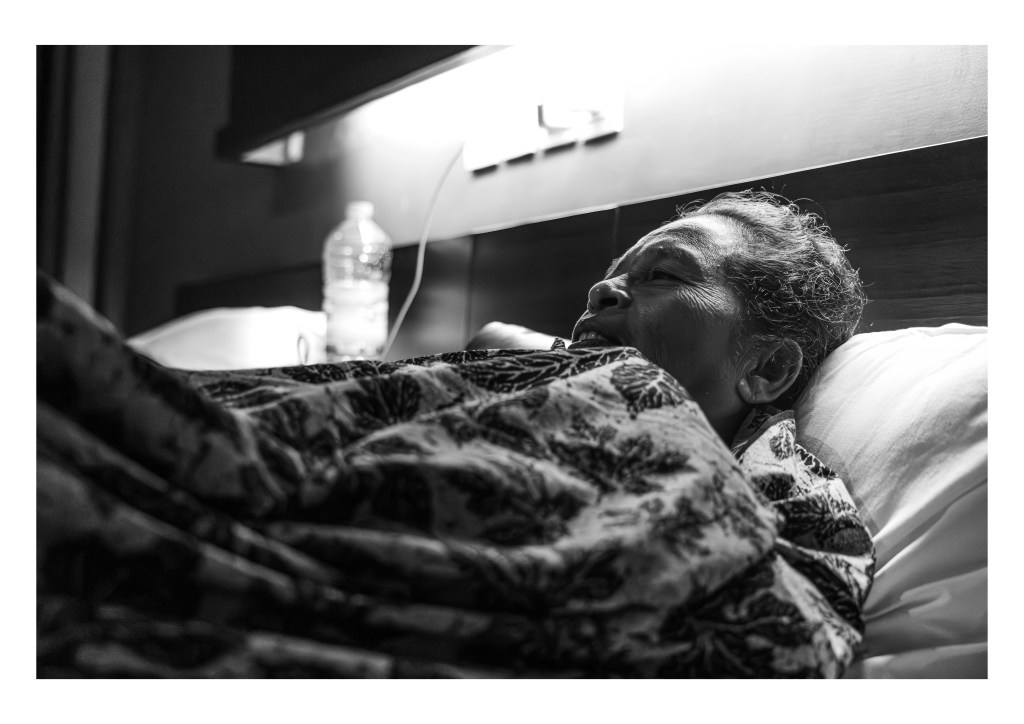 Outdoors, the average temperature for Timor-Leste residents is between 31 and 37 degrees Fahrenheit, while the coldest temperature indoors is 16 degrees. Therefore, I photograph the condition of my mother, who isn’t used to the cold weather (I attempted to simulate the weather of England by increasing the air conditioning to 18 degrees so that her body would not be shocked when she arrived in England during the last two nights of her stay in Bali).